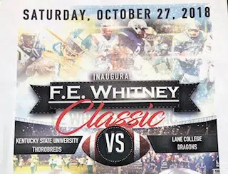 The first college football game to be played in Hopkinsville takes place this afternoon at the Stadium of Champions. The FE Whitney Classic has the Kentucky State Thorobreds meeting the Lane College Dragons. Kentucky State, led by Coach John L. Smith is 0-8 on the season while Lane College is 2-5. Kickoff is at 2 pm with the gates opening at 12 noon.