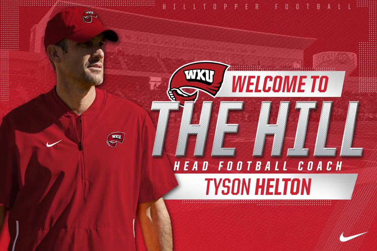 Western Kentucky University introduced Tyson Helton as its 21st head coach today. Helton described WKU and Bowling Green as his favorite stop in his coaching career. Helton worked this past season as the University of Tennessee’s offensive coordinator and once served in the same capacity under Jeff Brohm at WKU. Helton replaces Mike Sanford who was fired after two seasons on Sunday.