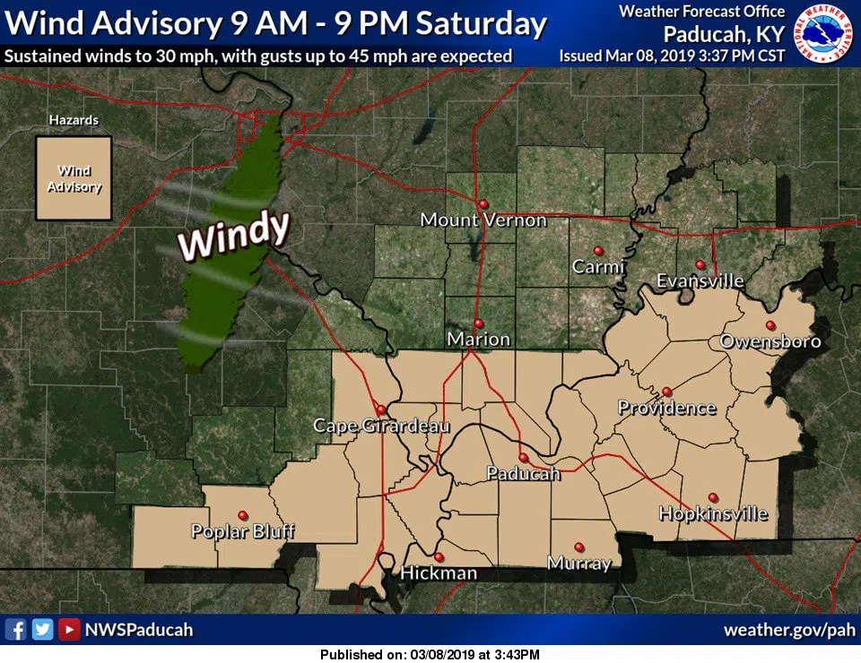 A Wind Advisory is also in effect from 9 a.m. until 9 p.m. Saturday for western Kentucky.