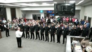 To start the meeting, the Hopkinsville Fire Department was recognized for recent recruits, promotions and retirements. After graduating from the Fire Academy in September, twelve new firefighters were sworn in by Hopkinsville Mayor J.R. Knight. The following firefighters were sworn in: Dalton Castile, Cambrin Hayes, Jamison Sholar, James Young, Zachary Ohm, John Tyler DeArmond, Justin Newby, Keith Stallons, Sahib Farmer, Jeffery Medina, Jordan Ladd and Michael Klawes.
