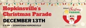 Got a float? A band? A business, club, or even a decked-out golf cart? Bring the lights, bring the music, bring the holiday cheer โ and help turn Downtown Hopkinsville into a glowing winter wonderland! ![]()