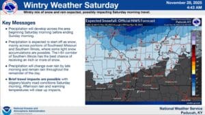 That said, it’s still going to be plenty cold, so if you’re heading out for some Shop Small Saturday shopping trips, make sure to grab your coat. The National Weather Service in Paducah is expecting highs in the mid-40’s Saturday with lows in the upper 20’s, and it’s looking like it will be mostly rain that falls in our area.