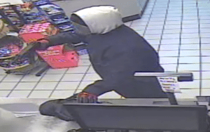The suspect is described as a white male, standing approximately 5’6 with blue eyes. He was last seen wearing dark clothing, a dark face mask, red gloves and a white hoodie.