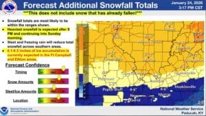 Meteorologists are calling for the possibility of another four to seven inches across western Kentucky, with higher amounts likely to our north, and then places in Christian, Todd, Trigg and surrounding counties could get around an inch of sleet and a quarter of an inch of ice, as the precipitation switches over to sleet and freezing rain. The more sleet and ice we get, the less snow, but it will make area roadways even more treacherous to traverse.