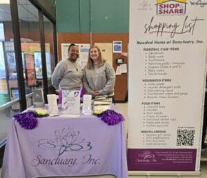 Sanctuary volunteers will have tables set up near the entrances, where people can drop off items, learn about Sanctuary, and pick up donation shopping lists. Lancaster says they are searching for personal care items, nonperishable foods and cleaning items.