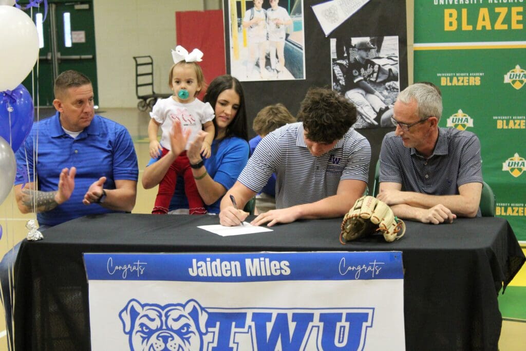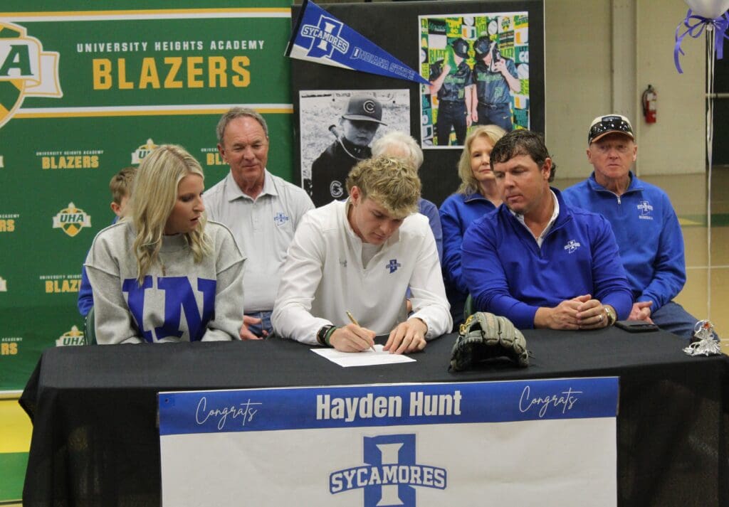 Two University Heights Academy baseball players signed college letters-of-intent during a ceremony on Friday morning in Blazer Gym in front of the student body, families and friends.