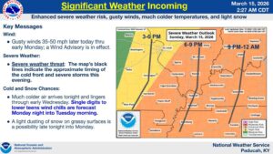That includes Christian, Todd and Trigg Counties, as a line of storms is set to howl through the area Sunday night in front of a cold front, and it will bring the chance for widespread damaging winds and a couple of tornadoes. Meteorologist Justin Gibbs with the National Weather Service in Paducah says there will be enough spin in the atmosphere that a tornado is certainly possible, and it would have the risk of being a strong one as well, even if it spins up on the squall line.