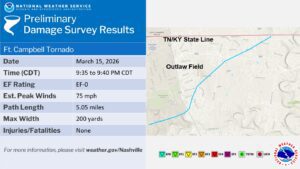 According to the damage survey, three tornadoes touched down in middle-Tennessee during the Ides of March storm, and one of those was determined to be an EF-0 that touched down in a neighborhood on Fort Campbell and traveled for just over five miles near the Outlaw Air Field. It would lift just near the Tennessee and Kentucky state line in Oak Grove.