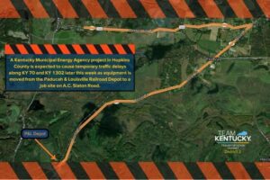 KY 70 from Pleasant View Road, also known as KY 1302, to the Paducah and Louisville Railroad Depot, and Pleasant View Road from KY 70 to A.C. Slaton Road will be closed to allow crews to transport oversized equipment. The closures will start at 9 a.m. each day and will reopen around 11 a.m.
