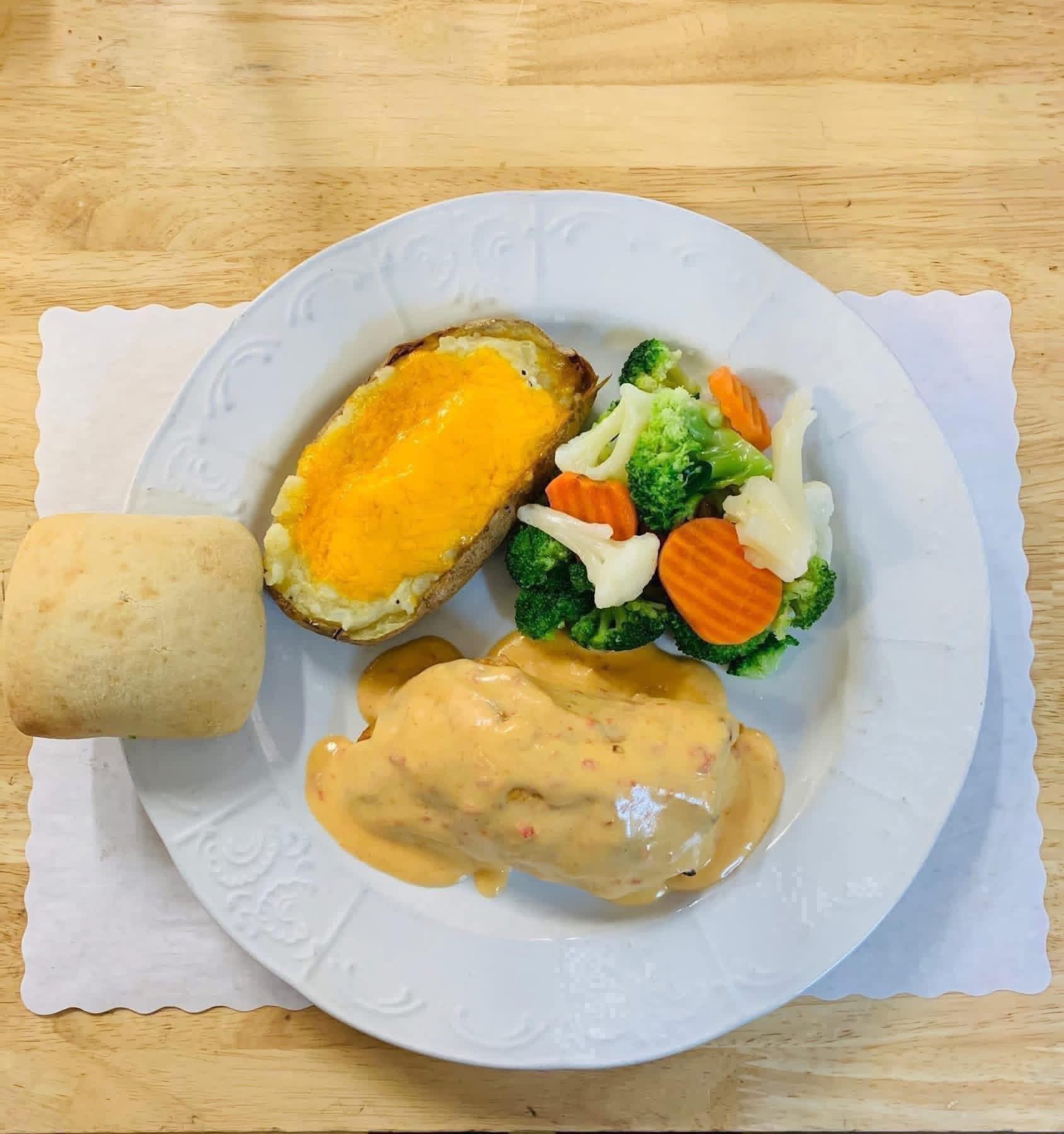 Friday is for our signature stuffed chicken dish. Cheese stuffed chicken is oven roasted and finished with our signature cream sauce. A twice baked potato and your choice between steamed vegetables or green beans with a roll complete the dish! Friday fabulous finish! $13.00 per person.