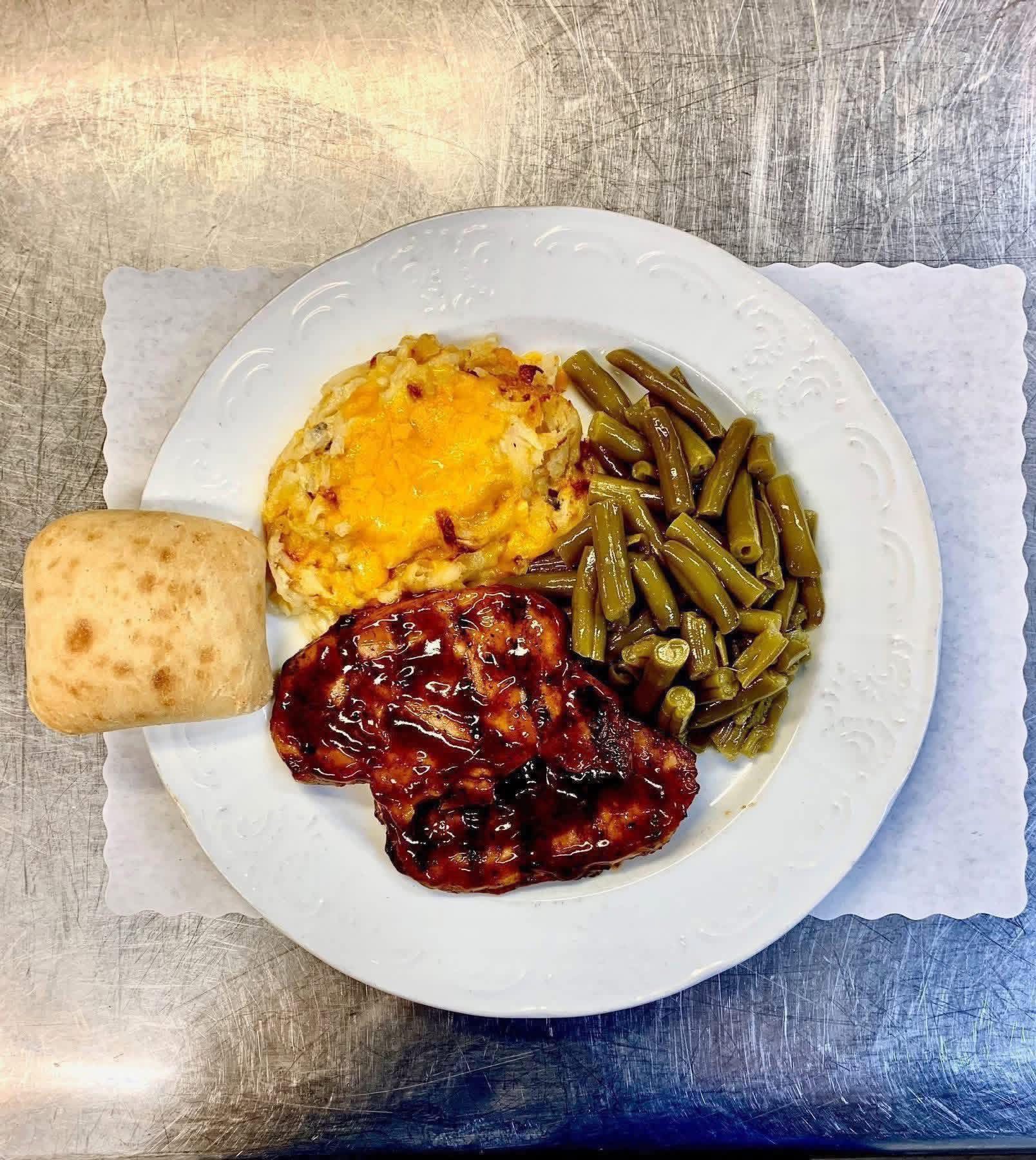 Tuesday is for pork chops. Grilled pork chops are tossed with our homemade BBQ sauce and served with our hashbrown casserole (no onions), green beans and a yeast roll. Yum! 13.00 per person